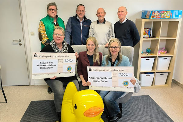 Im letzten Sommer hat das erste Heidenheimer Entchenrennen auf der Brenz die City belebt; übrigens wird es nächsten Sommer, aufgrund des großen Erfolgs, wiederholt. Organisiert hat das der Lions-Club Giengen-Heidenheim, der jetzt, wie versprochen, den Erlös der bunten Aktion in Höhe von 12.000 Euro an den Heidenheimer Kinderschutzbund übergab sowie an die Initiative „Hinsehen“, die sich in Stadt und Kreis um Prävention an Schulen kümmert und sexualisierter Gewalt gegen Kinder und Jugendliche entgegen wirken will.